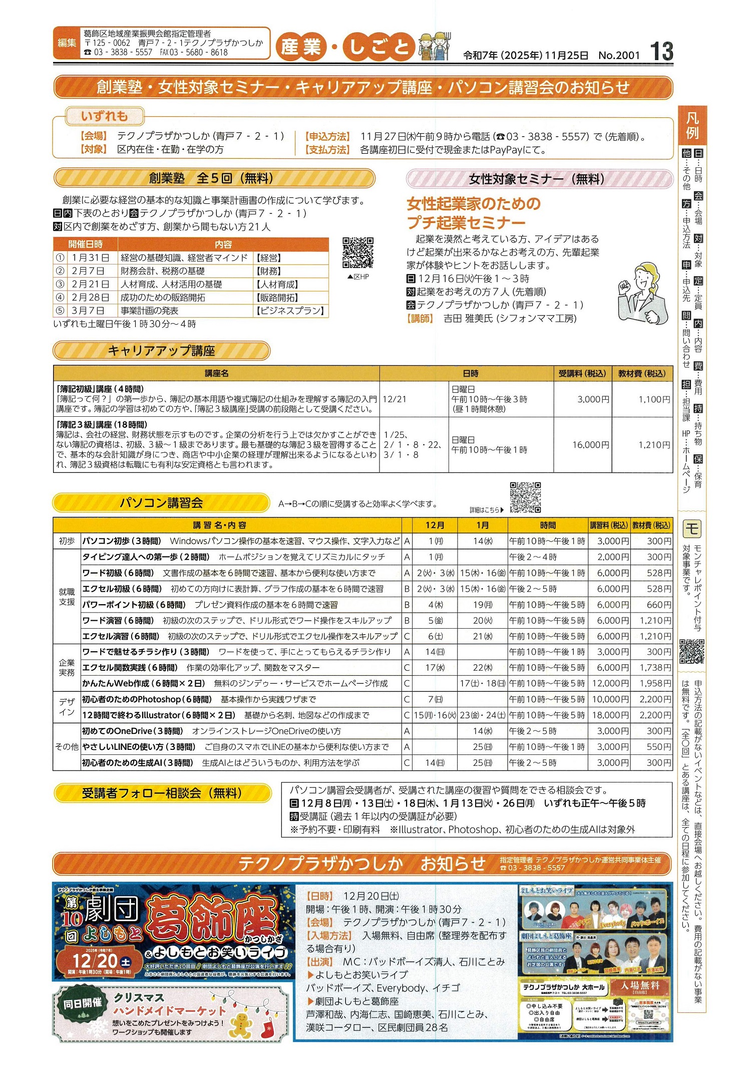 キャリアアップ講座・パソコン講座・セミナー(広報かつしか 13面)のお申し込みはお電話で、11月27日(木)9時より受付開始です。
